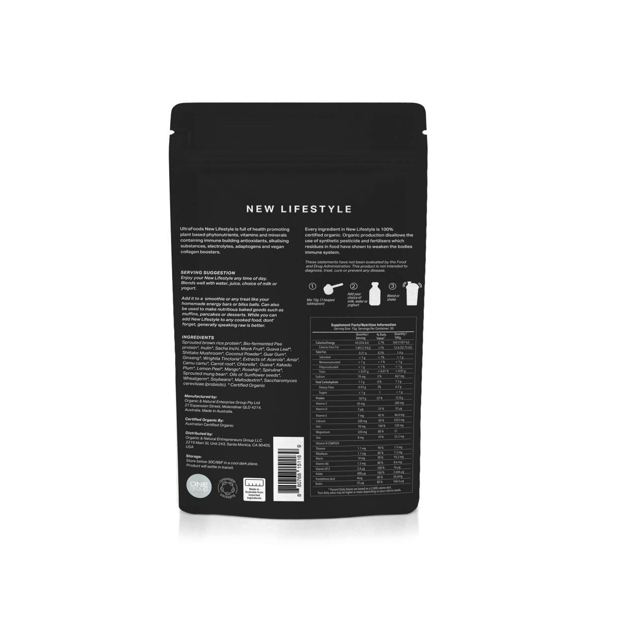 New Lifestyle is a complete complex potent blend of 100% certified organic vitamins, minerals & other essential nutrients like immune building antioxidants, alkalising substances, electrolytes & collagen boosters delivered in one tasty 15g scoop.